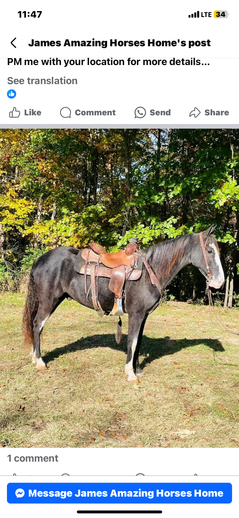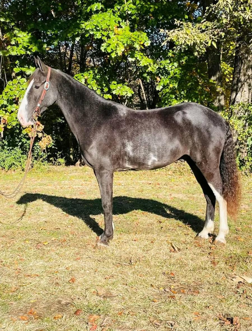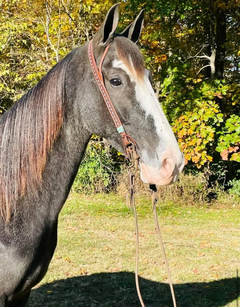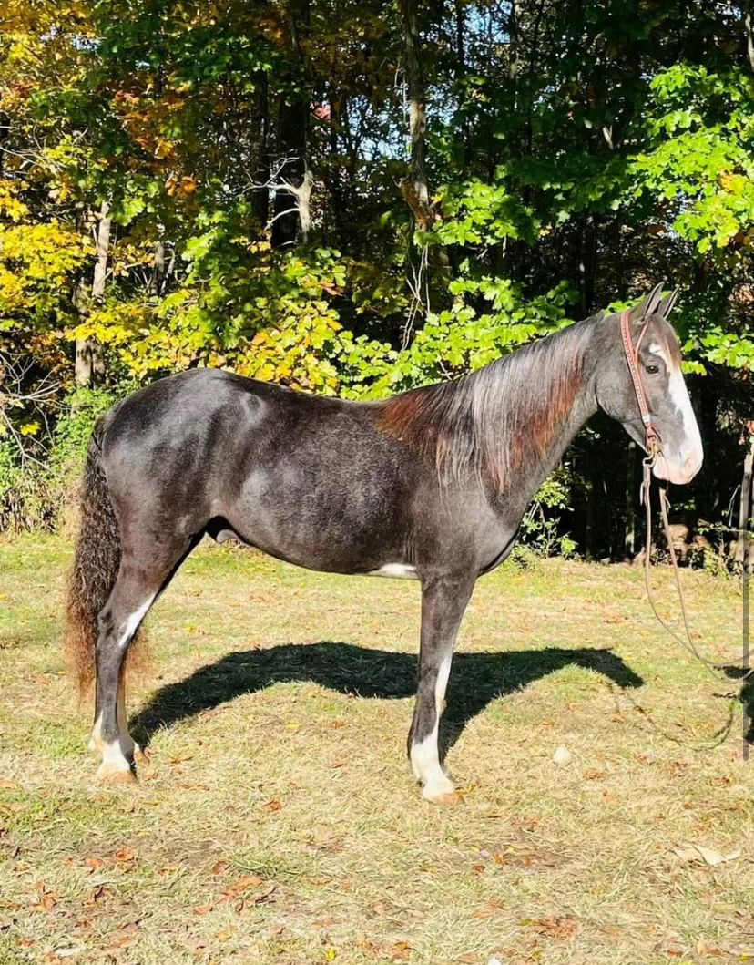 Mace is a 4 year old, Black Roan, Grade Kentucky Mountain Gelding. He stands at 15 hands and is sharp as they come. Mace was trained by a 60 year old man who had ridden him all over the hills. My 13 year old has been riding him everywhere. He will go where he is pointed and is gentle and easy to be around.